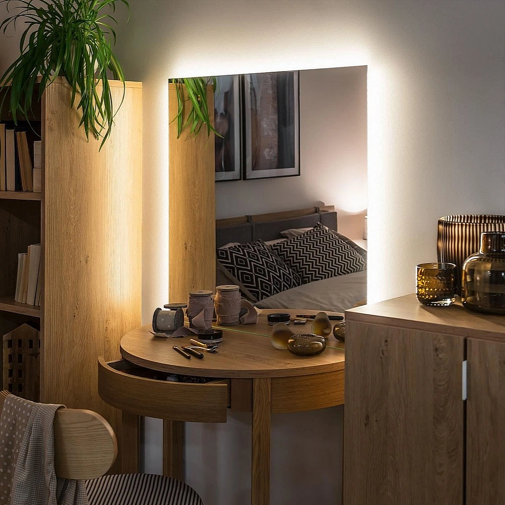 The mirror has a discreet light source, the source of which is hidden behind the edge of the mirror surface. The switch has the ability to adjust the light intensity (it is adjusted by holding the button longer or shorter). The lighting makes it easier to do evening make-up and also introduces atmospheric light to the bedroom. The minimalist light switch is located on the front of the mirror (in the lower right corner).